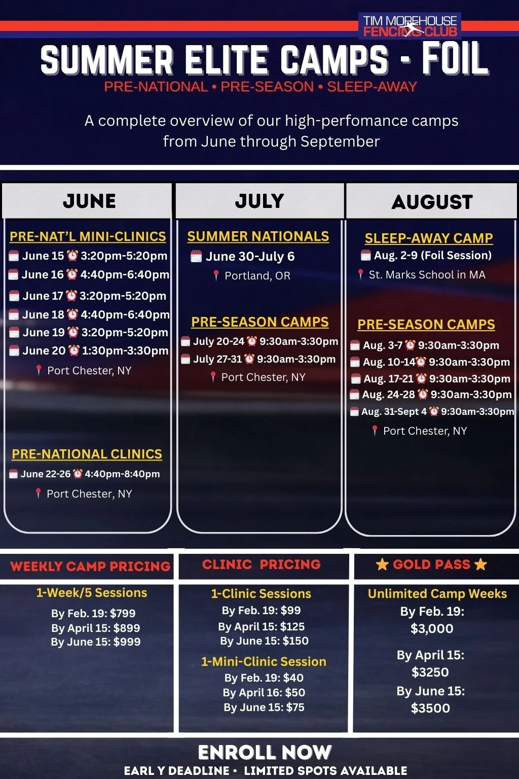 This schedule provides a high-level view of our elite foil training calendar, designed to support athletes at key moments of the competitive season—from pre-national preparation, through Summer Nationals, to pre-season and sleep-away training.