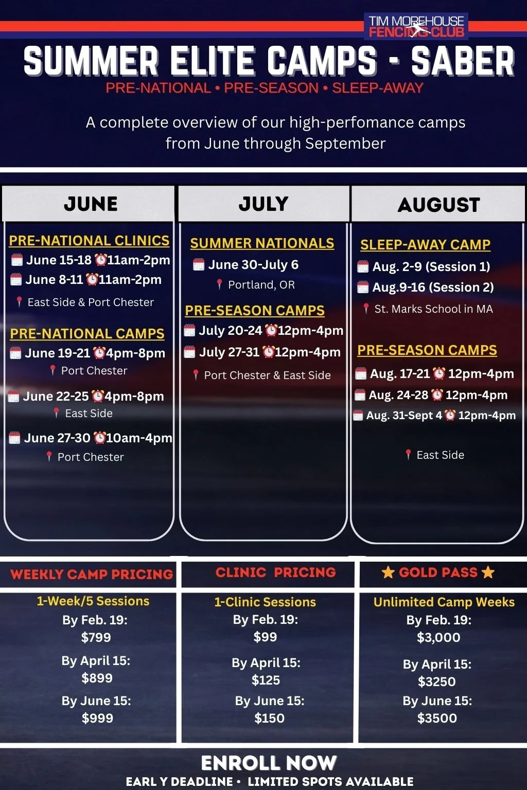 This schedule provides a high-level view of our elite saber training calendar, designed to support athletes at key moments of the competitive season—from pre-national preparation, through Summer Nationals, to pre-season and sleep-away training.