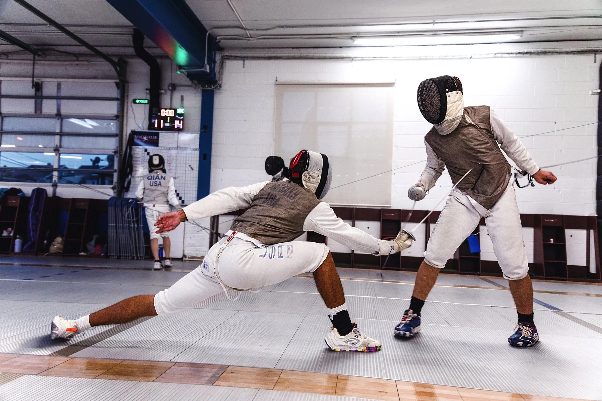 Two male fencers in white fencing gear, one with 'Lee USA' on the back, engaged in a fencing match inside a fencing salle, with other participants and officials in the background.