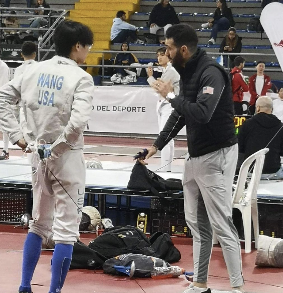 Wang fenced earlier in the tournament in Junior Men’s Saber. He fought his way to fifth place, with Coach Ziad Elsissy encouraging him along the way.