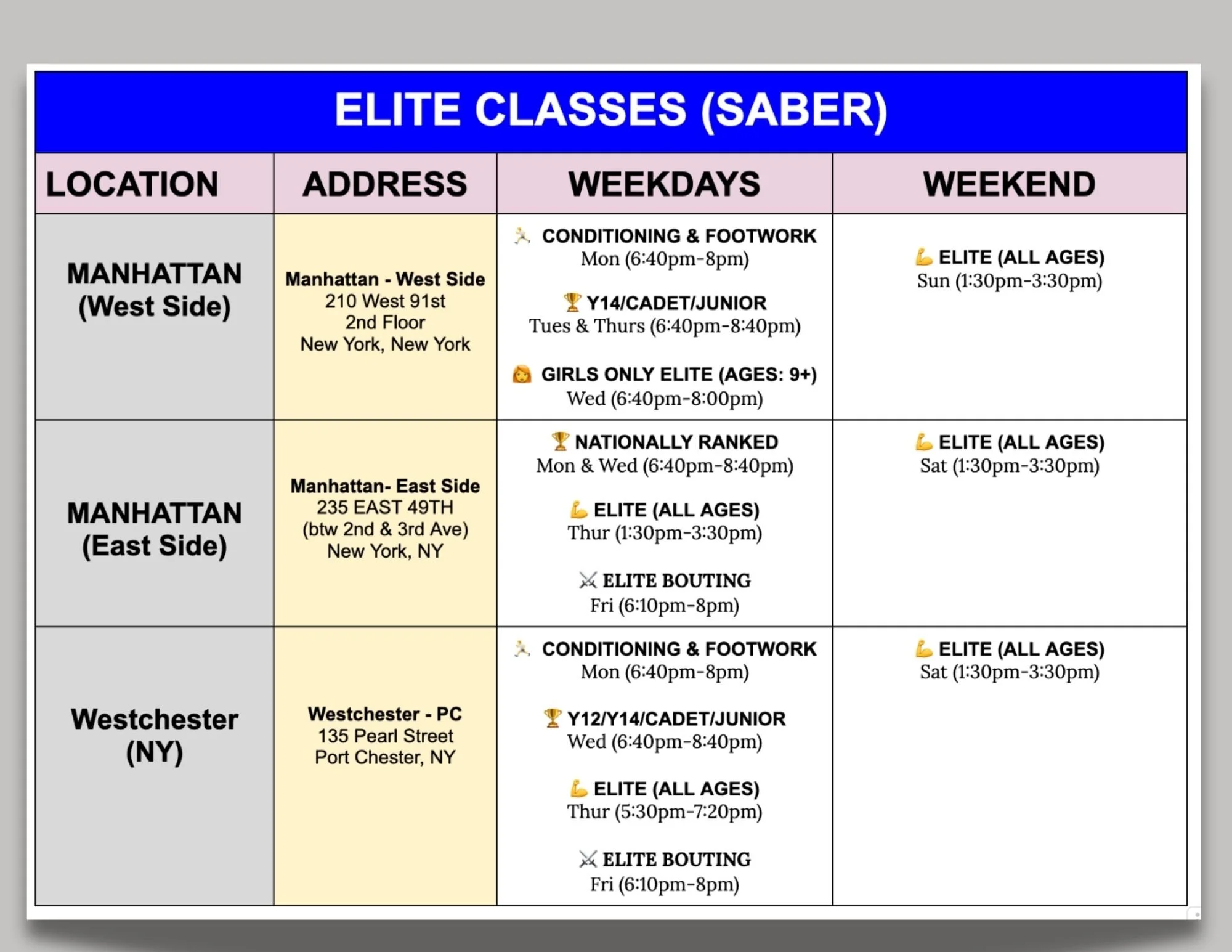 Our Elite Saber Classes are offered in Manhattan at our West Side and East Side locations, as well as in Westchester County.